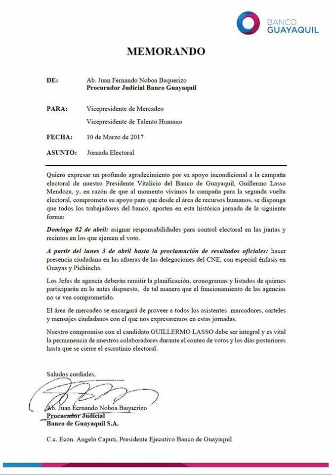 En el comunicado se puede leer «Nuestro compromiso con el candidato Guillermo Lasso debe ser integral y es vital la permanencia de nuestros colaboradores durante el conteo de votos y días posteriores hasta que se cierre el escrutinio electoral».