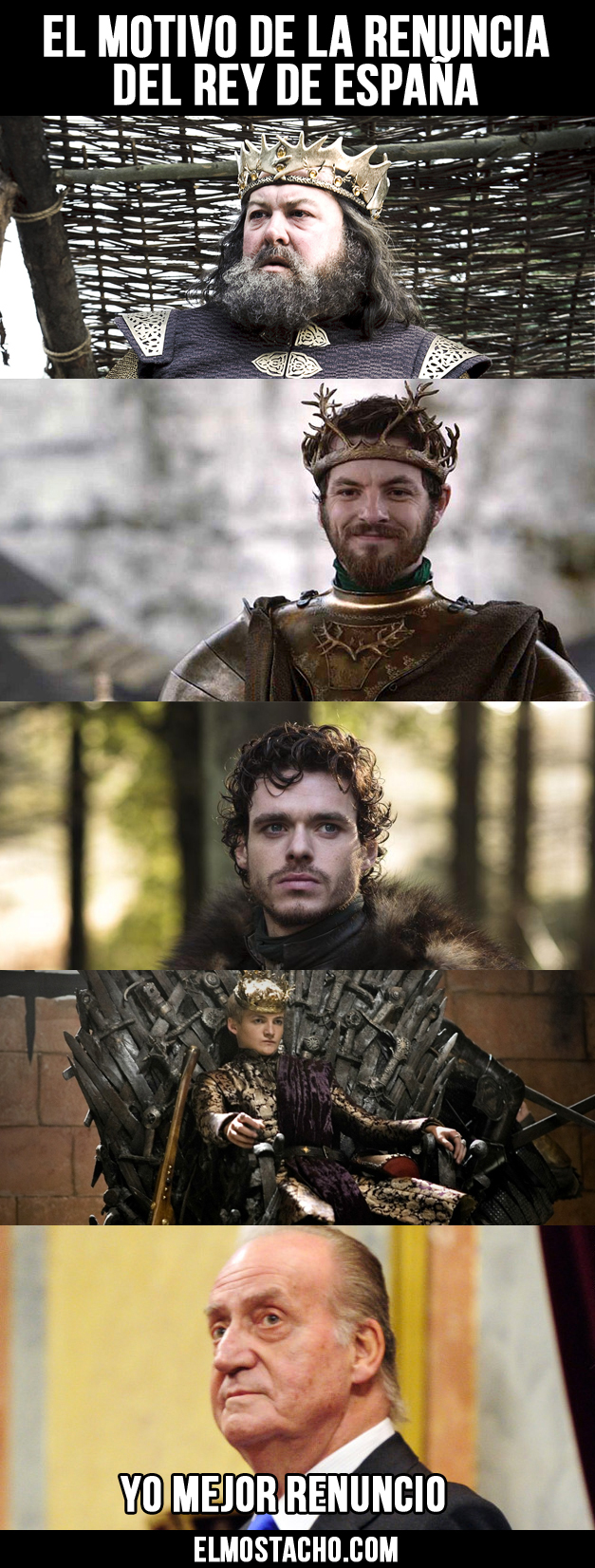 Después de la muerte del Rey Joffrey Baretheon en la serie de televisión Game Of Thrones (Juego de Tronos) el Monarca Español pasó por una gran depresión que lo puso a pensar sobre la vida y motivó su renuncia. Para evitar que le pasara lo mismo que a los reyes de la exitosa serie de HBO.